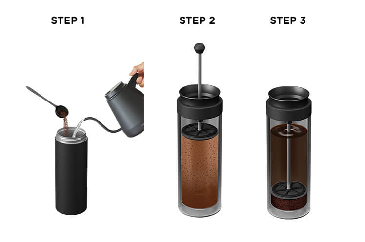 コーヒープレスがひとつに - 他に抽出器具がいらないから、オフィスでもアウトドアでも、手軽にお気に入りのコーヒーを楽しめます。